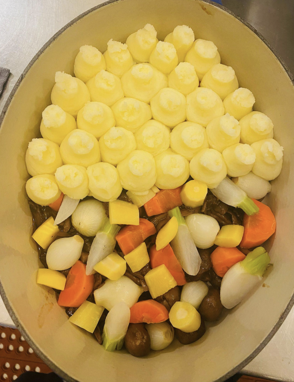 6. Then, place the parsnips, carrots, and turnips, one by one to cover the mushrooms